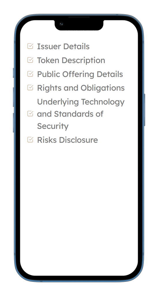 MiCA requires that the white paper include at least the information about the issuer; a description of the cryptoasset, its features, and technology; details of the offer or admission to trading; rights, obligations, and risks for holders; financial information (if available); a statement of the issuer’s liability; and a detailed description of the complaint procedure(s).